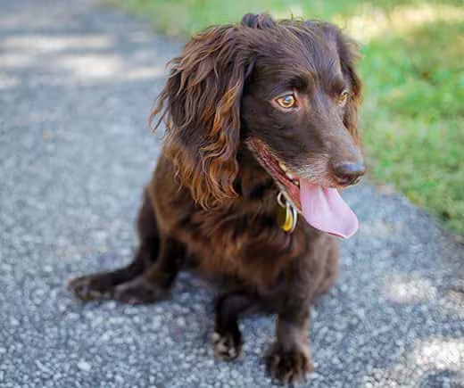 El Boykin Spaniel es un perro marrón de tamaño mediano con orejas caídas como las de un spaniel y un pelaje de color marrón hígado intenso.